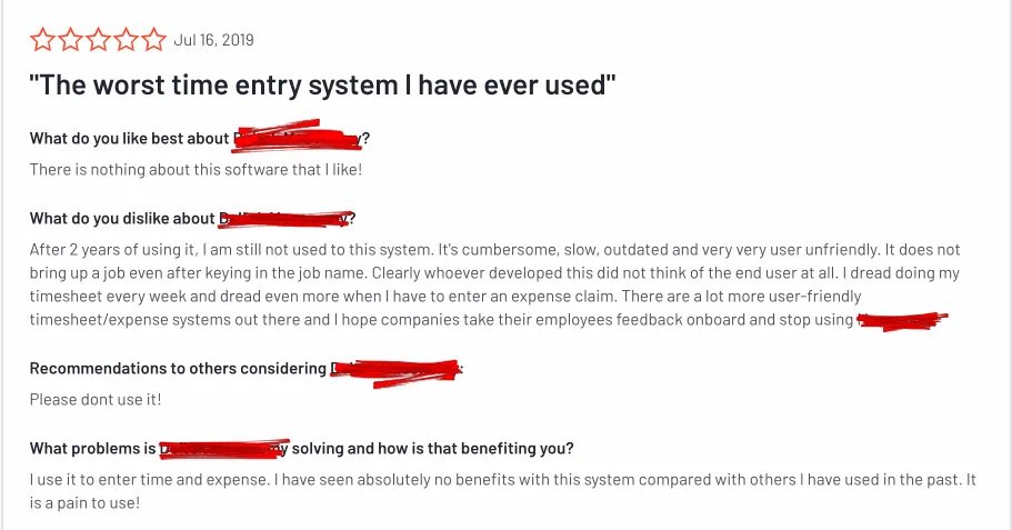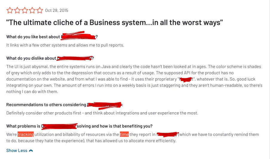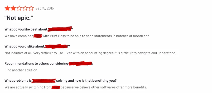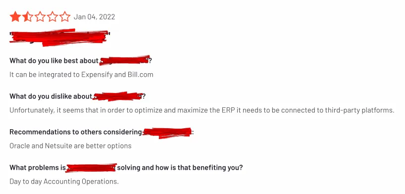 The screenshots displayed in this article have been sourced from G2 reviews of several ERP platforms and are intended to showcase the negative feedback concerning ERP usability. To protect the anonymity of our competitors, the names of the specific ERP systems have been redacted.