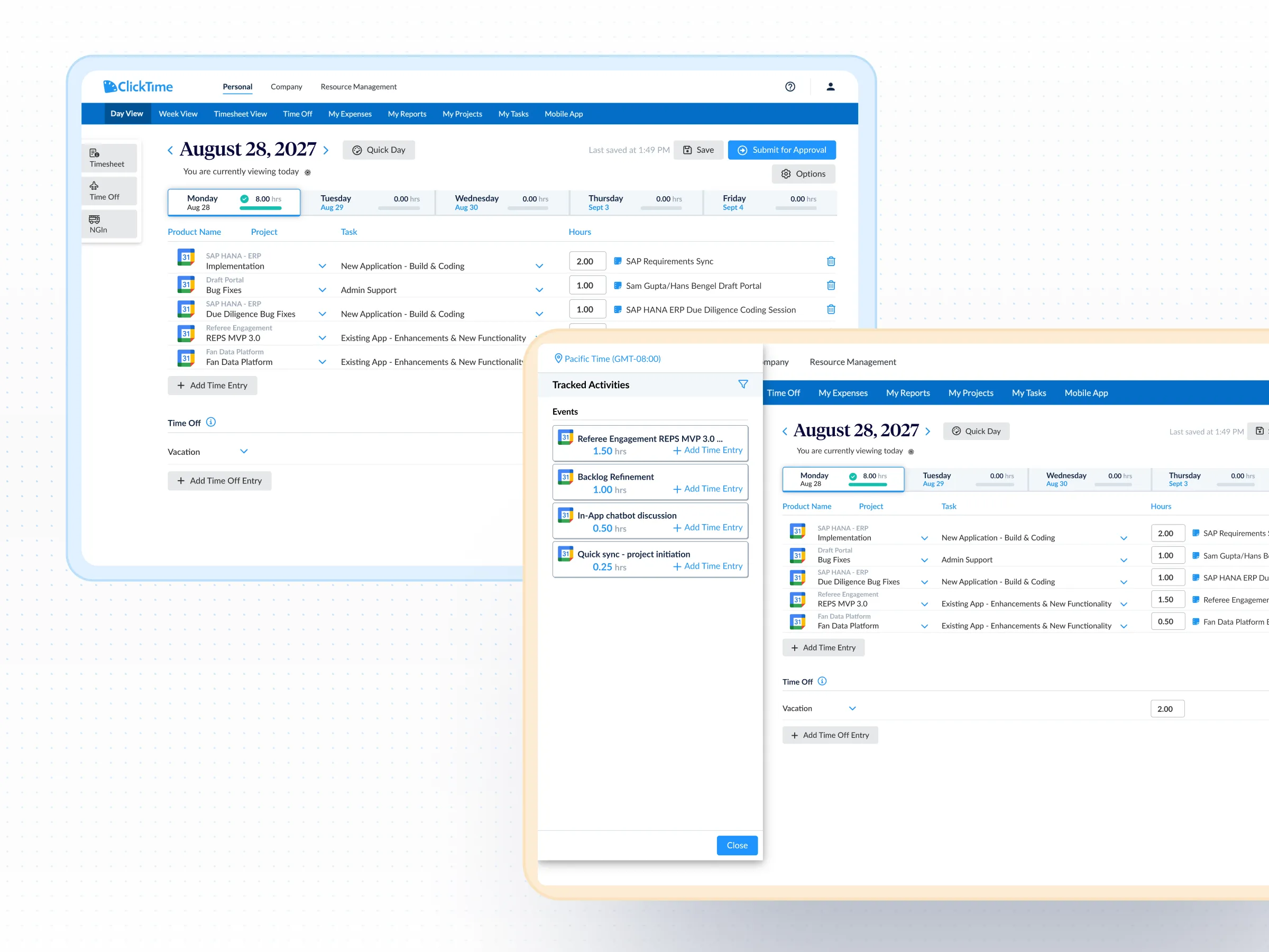 ClickTime + Google Workspace pulls events from Google Calendar directly into ClickTime, where employees can review and convert them into structured time entries using your existing project, task, and cost-center setup.
