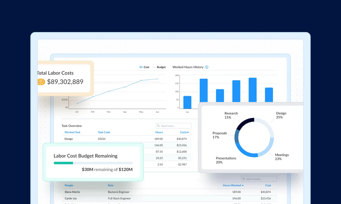 Try interactive demos showing how finance, operations, and professional services teams get clean, complete labor cost data for cost control, budget management, and client billing.