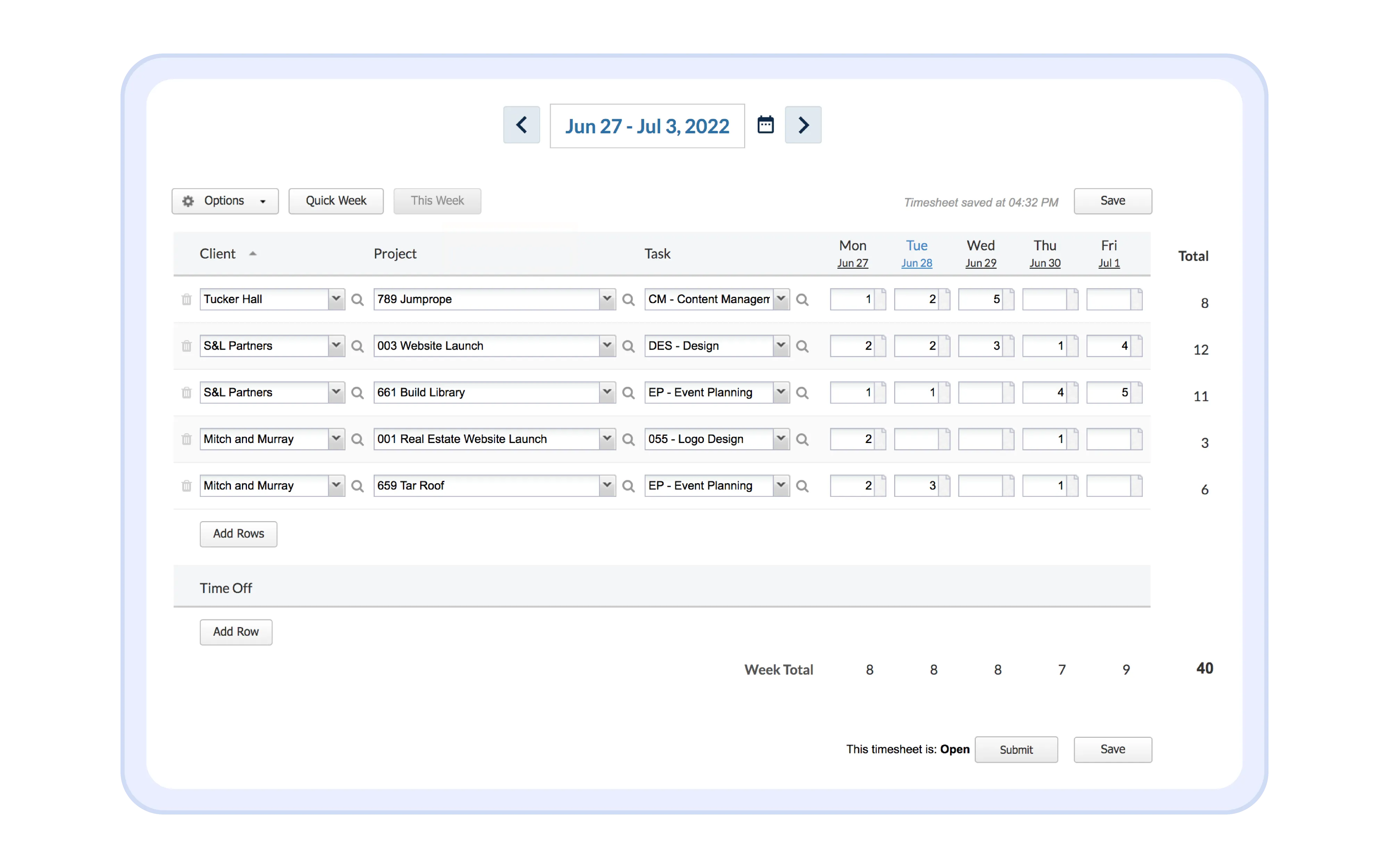 - Enter the tasks and hours worked.