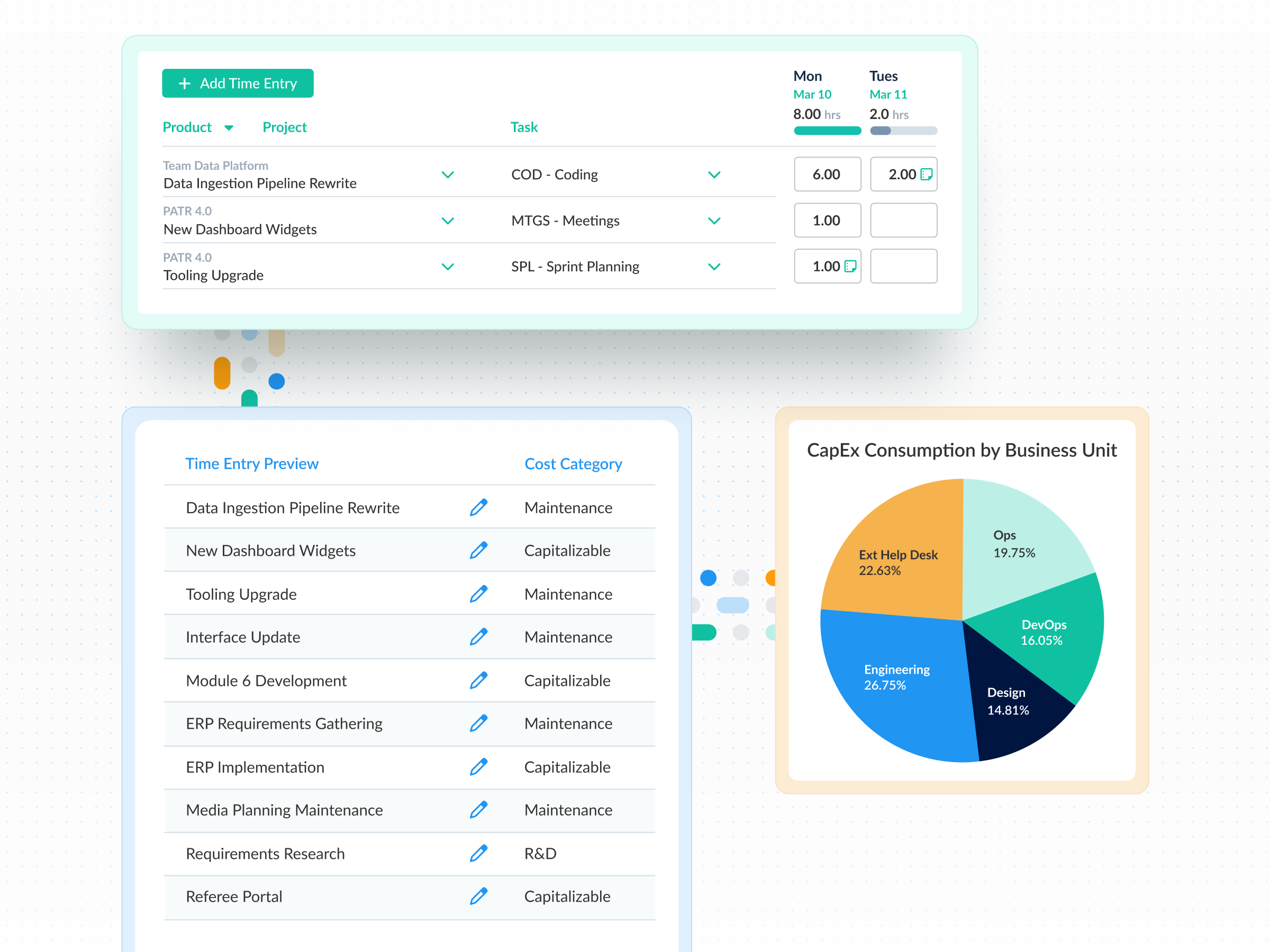 ClickTime’s Resource Management Grid shows how labor is allocated across capital and operational work in real time. The Capacity Planning Heatmap reveals future resource needs so next year’s CapEx budget is based on actual labor patterns—not assumptions.